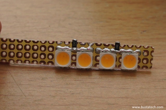 Cette deuxième étape consiste à relier ensemble les leds et les résistances SMD. Nous avons choisi d’utiliser 6 leds mais de les brancher en parallèle par deux. On utilise donc une résistance de 30 Ohm pour deux leds. La tension d’alimentation des leds étant de 3,5V, pour une tension d’alimentation de 5V, nous avons (5-3.5)/30 = 50mA pour 2 x LEDs (puisqu’elles sont montées en parallèle). Ce qui revient à avoir 25mA dans chaque Led.
