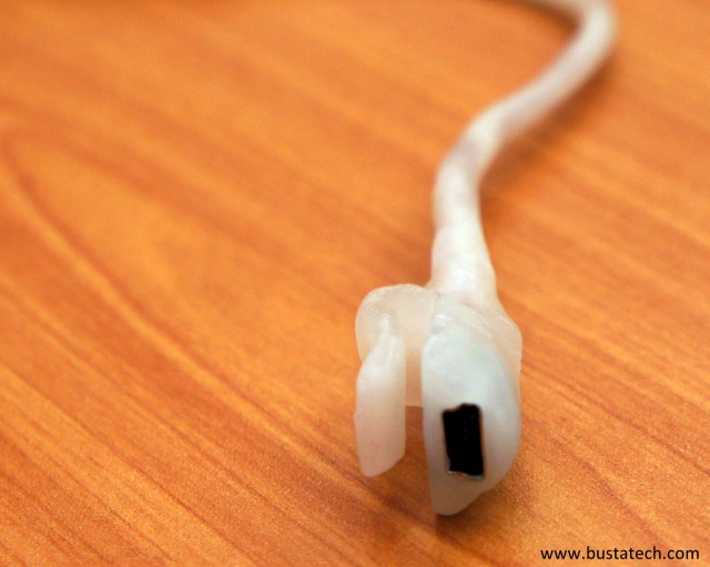 Comme vous pouvez le voir, l’ensemble USB + Fils + Leds a été recouvert de polymorph afin de rendre notre lampe étanche. L’épaisseur de polymorph récouvrant les leds est faible pour faciliter le passage de la lumière produite par les leds, ce qui donne au final une lumière diffuse.
